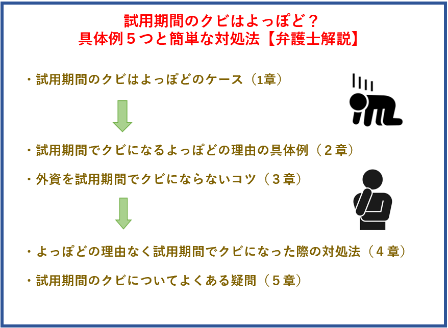 以上のとおり、今回は、試用期間のクビはよっぽどの場合であることを説明したうえで、具体例5つと簡単な対処法を解説しました。